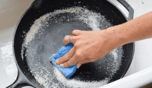 Arrêtez! Ne nettoyez pas cette poêle avec du savon et de l’eau! Vous pouvez le faire rouiller, et une poêle rouillée est une poêle en ruine. Nettoyez-le à la place avec du sel. Voici comment: lorsque vous avez terminé la cuisson, mais pendant que la poêle est encore chaude, versez 1/4 tasse de sel et frottez-la avec une brosse métallique. Essuyez la poêle, séchez-la et frottez-la légèrement d’huile végétale avant de la ranger. Votre poêle aura une durée de vie beaucoup plus longue.