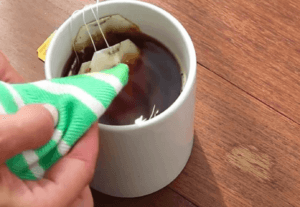 Avez-vous une tache décolorée sur votre parquet, par exemple à cause de dégâts d’eau? Faites une tasse de thé puis trempez un chiffon dedans. Utilisez le chiffon avec le thé pour frotter soigneusement la tache lumineuse de votre sol afin de l’assombrir. Répétez ce processus jusqu’à ce que le point ait plus ou moins la même couleur que le reste du sol.